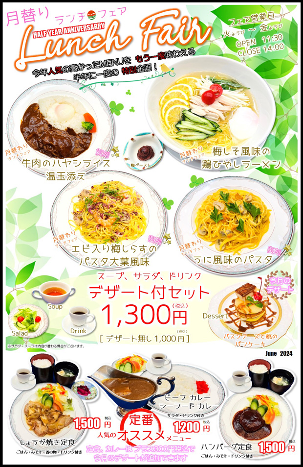 6月のランチは人気の高かったMENUをもう一度味わえる半年に一度の特別企画!”半周年記念祭”を開催いたします。