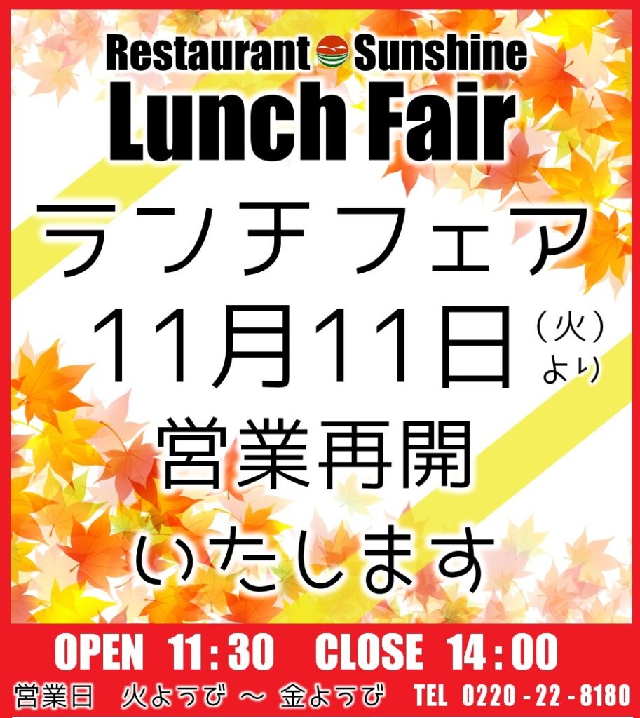 休止しておりましたランチ営業を11月11日(火)より再開致します。