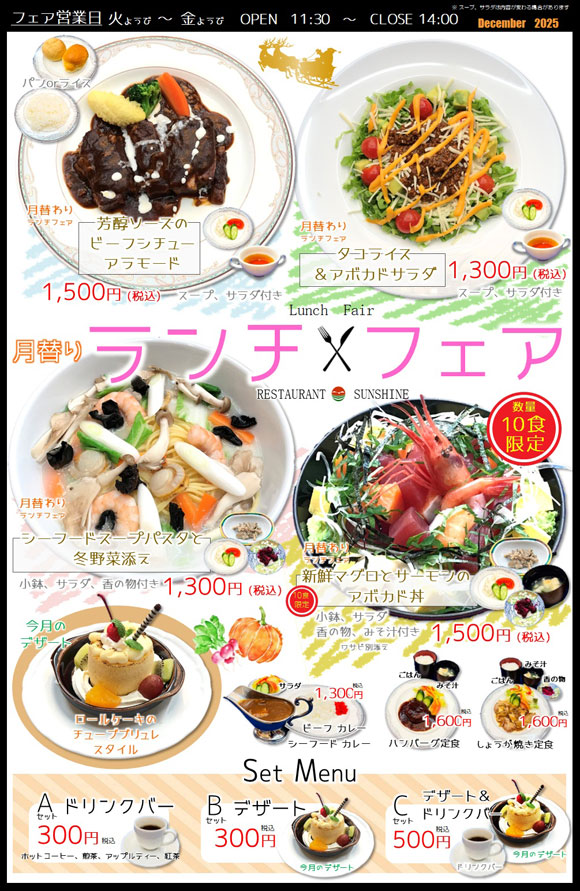 ※土、日曜日、祝日は通常メニュー”グランドメニュー”(別メニュー)でのご提供になります。